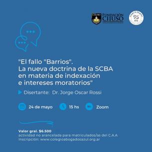 Nueva charla en el Colegio sobre el Fallo Barrios: la nueva doctrina de la SCBA en materia de indexaEl encuentro fue organizado por el Colegio de Abogados Departamental en colaboración con la Fundación CIJUSO. Se realizará el viernes 24 de mayo a partir de las 15 hs en modalidad virtual y estará a cargo del Dr. Jorge Oscar Rossi. LEER MÁS |