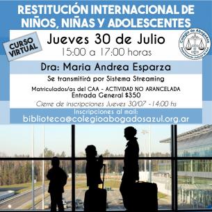 Charla: “Restitución internacional de niños, niñas y adolescentes”La Dra. María Andrea Esparza, especializada en esta temática, disertará el jueves 30/07 de 15 a 17hs, vía streaming. Inscripción hasta las 14hs de ese día, por mail: biblioteca@colegioabogados azul.org.ar LEER MÁS |