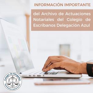 Información importante del Archivo de Actuaciones NotarialesSe informa que desde el 13/7 el Archivo de Actuaciones Notariales del Colegio de Escribanos de la Delegación Azul (que comprende los Protocolos de los escribanos de los Partidos de: Azul, Bolívar; Gral. Alvear, Gral. Lamadrid, Laprida, Las Flores, Tapalqué y Olavarría); por falta de espacio y posibilidad de crecimiento edilicio se trasladaron Tandil, Rauch y Ayacucho al Archivo de La Plata. El domicilio electrónico es: colegioescribanos-archivonotarial-az@ces.notificaciones LEER MÁS |