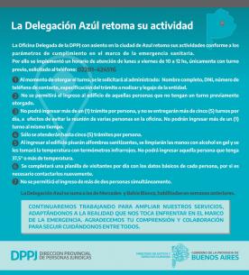 Personas Jurídicas: La Delegación Azul retoma su actividadLa Oficina Delegada de la DPPJ con asiento en la sede del Colegio de Abogados del Departamento Judicial de Azul (Av. Pte Perón 514) retoma sus actividades conforme a los parámetros de cumplimiento en el marco de la emergencia sanitaria LEER MÁS |