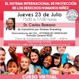 Charla: “El sistema internacional de protección de los Derechos Humanos Niñez”El Dr. Carlos Romano, destacado especialista, disertará sobre esta temática el jueves 23/07 de 15 a 17hs vía streaming. Esta capacitación es no arancelada para matriculadas y matriculados del CAA. Inscripciones: biblioteca@colegioabogadosazul.org.ar LEER MÁS |