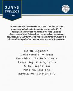 Acto de Jura de nuevas matriculadas y matriculadosEl viernes 17 de noviembre a las 13 hs, con modalidad presencial en la sede de Azul (Av. Perón 514) y transmisión vía YouTube; las autoridades del Colegio de Abogados Departamental tomarán juramento a las abogadas, abogados y procuradores cuya nómina ponemos en consideración pública. LEER MÁS |