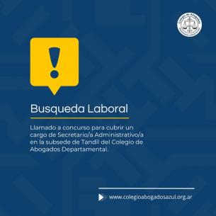 Búsqueda laboral: Cargo de Secretario/a Administrativo/a en la subsede de TandilSe informa a la comunidad que el Colegio de Abogados del Departamento Judicial de Azul inició la búsqueda laboral para cubrir un cargo de Secretario/a Administrativo/a en la subsede de Tandil del C.A.A. LEER MÁS |