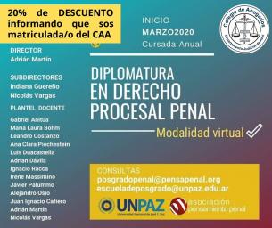 Diplomatura en Derecho Procesal PenalInformando que sos matriculada/matriculado del CAA, obtendrás un 20% de descuento en esta especialización de modalidad virtual, dictada por la Universidad Nacional de José C. Paz (UNPAZ) y la Asociación de Pensamiento Penal (APP) que inicia en marzo. LEER MÁS |