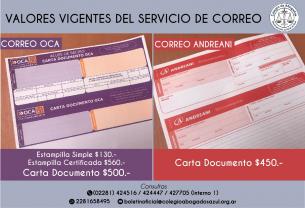Valores vigentes del Servicio de CorreoColegiadas y colegiados pueden utilizar los servicios de correo OCA o Andreani, de acuerdo a su preferencia, en Mesa de Entradas del CAA. LEER MÁS |
