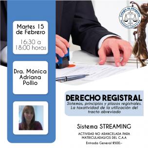 Charla: "Derecho Registral"La misma tendrá lugar el martes 15, vía streaming, de 16:30 a 18 horas y estará a cargo de la Dra. Mónica Adriana Pollio. LEER MÁS |