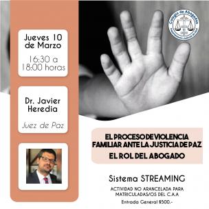 Charla: “El proceso de violencia familiar en la Justicia de Paz. El rol del abogado”El Dr. Javier Heredia, Juez de Paz, brindará esta capacitación no arancelada para matriculadas y matriculados el jueves 10 de marzo de 16:30 a 18 horas, vía Sistema Streaming. LEER MÁS |