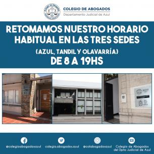 Retomamos nuestro horario habitual de atenciónCon el inicio del año judicial, el personal del C.A.A está a disposición de nuestras matriculadas y matriculados de lunes a viernes de 8 a 19hs en las tres sedes (Azul, Tandil y Olavarría). LEER MÁS |
