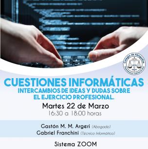 Charla - Taller: “Cuestiones Informáticas”El martes 22 de marzo de 16.30 a 18hs, el presidente del C.A.A Dr. Gastón M.M. Argeri junto al Técnico Informático Gabriel Franchini brindarán esta capacitación vía Sistema Zoom, no arancelada para matriculadas y matriculados. LEER MÁS |