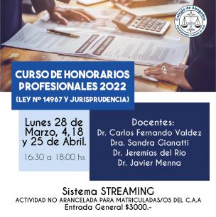 Curso de Honorarios ProfesionalesCon un destacado equipo docente integrado por el Dr. Carlos Fernando Valdez, la Dra. Sandra Gianatti, el Dr. Jeremías del Río y el Dr. Javier Menna; esta capacitación no arancelada para matriculadas y matriculados se dictará los días lunes 28/03, 4/04, 18/04 y 25/04 de 16.30 a 18 horas. LEER MÁS |