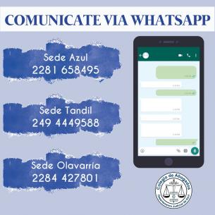Comunicate vía WhatsApp con el Colegio de Abogados DepartamentalBuscando estar siempre conectados con matriculadas y matriculados, mantenemos disponibles las líneas para comunicarse vía WhatsApp con las sedes de Azul, Olavarría y Tandil. LEER MÁS |