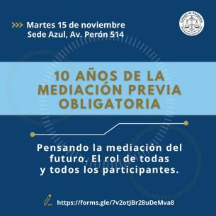 Pensando la mediación del futuro. El rol de todas y todos los participantes.A 10 años de la Mediación Previa Obligatoria, el martes 15 de noviembre de 10 a 17 hs, se realizará una jornada con modalidad presencial en la sede del Colegio de Abogados Departamental (Av. Perón N° 514, Azul). LEER MÁS |