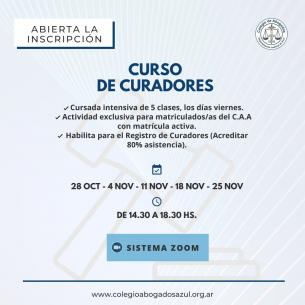 Continúa el Curso de CuradoresEsta capacitación exclusiva para matriculados/as del C.A.A con matrícula activa, habilita para el Registro de Curadores. La cursada es intensiva con modalidad virtual (vía Zoom) y duración de 5 clases. LEER MÁS |