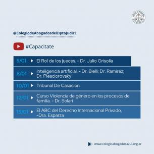 Capacitate durante la Feria Judicial a través de nuestro canal YouTubeDurante el mes de enero, el Colegio de Abogados Departamental dejará a disposición de las/os matriculadas/os capacitaciones académicas que se realizaron durante el año en nuestro canal de Youtube. Compartimos debajo los detalles de la habilitación de cada encuentro. LEER MÁS |