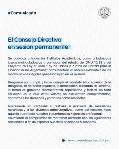 El Consejo Directivo en sesión permanenteAsimismo se convoca a todos los Institutos Académicos, como a todos/as los/as matriculados/as a participar del estudio del DNU 70/23 y del Proyecto de Ley titulado “Ley de Bases y Puntos de Partida para la Libertad de los Argentinos”, para efectuar un análisis exhaustivo de las modificaciones legales que se incluyen en los mismos. LEER MÁS |