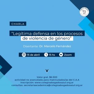 Charla: Legítima defensa en los procesos de violencia de géneroEl 15 de abril el Dr. Marcelo Fernández expondrá frente a las y los matriculados del Colegio sobre legítima defensa en los procesos de violencia de género. La charla se realizará en modalidad virtual a partir de las 15 hs. LEER MÁS |
