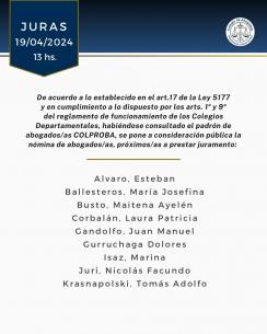 Acto de Jura de nuevas matriculadas y matriculadosEl próximo viernes 19 de abril a las 13 hs, con modalidad presencial en la sede de Azul (Av. Perón 514) y transmisión vía YouTube; las autoridades del Colegio de Abogados Departamental tomarán juramento a las abogadas, abogados y procuradores cuya nómina ponemos en consideración pública. LEER MÁS |