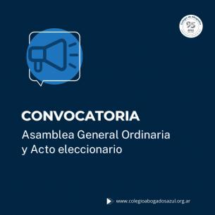 Convocatoria a Asamblea General Ordinaria y Acto EleccionarioEl Colegio de Abogados del Departamento Judicial Azul informa que se llevará a cabo la Asamblea General Ordinaria el 28 de mayo en la Sede del Colegio, en Av. Perón 514. Asimismo se convoca al Acto Eleccionario que se llevará a cabo el 17 de mayo de 8 a 15 hs en la Sede del Colegio de Azul, Olavarría, Tandil, Benito Juárez y Las Flores y de 8 a 14 hs en los Juzgados de Paz de Rauch, Bolívar, Lamadrid, Alvear y Tapalqué. LEER MÁS |