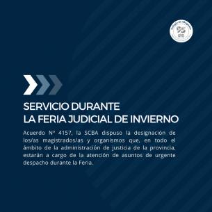 Servicio durante la Feria Judicial de InviernoMediante el Acuerdo Nº 4157, la Suprema Corte de Justicia dispuso la designación de los magistrados y organismos que, en todo el ámbito de la Administración de Justicia de la Provincia, estarán a cargo de la atención de asuntos de urgente despacho durante el servicio de feria entre el 15 y 26 de julio de 2024. LEER MÁS |