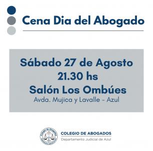 Cena Día del AbogadoEl sábado 27 de agosto desde las 21.30hs, en salón "Los Ombúes" (Av. Mujica y Lavalle, Azul) disfrutaremos de este tradicional encuentro. Las tarjetas estarán disponibles a partir del próximo miércoles 17 a través de los referentes de cada localidad y en las sedes del Colegio Departamental, donde también podrás consultar por el traslado desde Olavarría y Tandil. LEER MÁS |