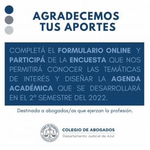 Último día para participar de la encuesta destinada a abogados/as que ejerzan la profesión.Hoy, lunes 15/08 finaliza el plazo para responder a esta consulta. El objetivo es conocer las temáticas de su interés y poder tenerlas en cuenta a la hora de diseñar la Agenda Académica que se desarrollará en el segundo semestre de este año 2022. LEER MÁS |