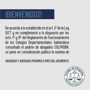 Acto de Jura de nuevas matriculadas y matriculadosEl jueves 18 de agosto a las 13hs, con modalidad presencial en la sede de Azul (Av. Perón 514) y transmisión en vivo desde nuestro canal de YouTube; las autoridades del Colegio de Abogados Departamental tomarán juramento a las abogadas y abogados cuya nómina ponemos en consideración pública... LEER MÁS |