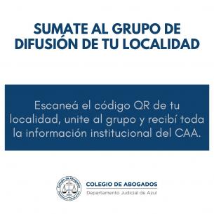 Sumate al grupo de difusión de tu localidad del Departamento Judicial.Escaneá la imagen del código QR correspondiente a tu localidad, unite al grupo y recibí toda la información institucional del CAA. LEER MÁS |