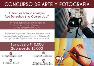 El Colegio de Abogados del Departamento Judicial de Azul invita a todas/os sus matriculadas/os a sumarse al concurso de Arte y Fotografía. La iniciativa se impulsa bajo la consigna "Los Derechos y la Comunidad”.Las obras deberán ser presentadas sin excepción hasta el viernes 29 de Noviembre de 2019.