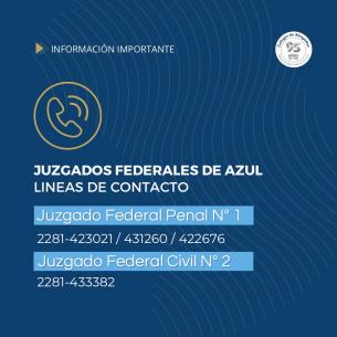 Información importante sobre las líneas de teléfono de los Juzgados Federales de AzulLas líneas de teléfono habituales de los Juzgados Federales 1 y 2 de Azul no funcionan, por ello es que se difunden los siguientes números para quienes deseen ponerse en contacto: Juzgado Federal Penal N° 1 (02281) 423021/431260/422676; Juzgado Federal Civil N° 2 (02281) 433382. LEER MÁS |