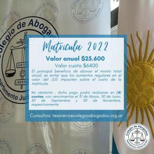 Nuevo valor de la matrícula anualEl valor de la matrícula anual 2022 se calcula en base al 90 % de 8 Jus arancelarios, tomándose el Jus Arancelario Ley Nº 14.967 de $3.554 (vigente desde el 1º de diciembre) ; por lo que el valor de cada cuota es de $6.400 mientras que el monto de la matrícula anual de $25.600.- LEER MÁS |