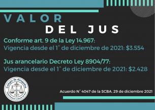 Valor vigente del JUSInformamos lo establecido mediante el Acuerdo N° 4047 de la SCBA. LEER MÁS |