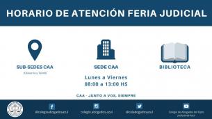 Horario de atención durante la Feria JudicialInformamos que la sede, subsedes y el servicio presencial de biblioteca del Colegio de Abogados Departamental, estarán a disposición de matriculadas y matriculados de lunes a viernes de 8 a 13hs. LEER MÁS |