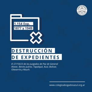 Destrucción de expedientes de Juzgados de PazEl 27 de octubre a la 12 hs se procederá a la destrucción de 1.154 expedientes iniciados en los Juzgados de Paz de General Alvear, Benito Juárez, Tapalqué, Azul, Bolívar, Olavarría y Rauch en el período comprendido entre 1877 y 1949 con plazos de guarda vencidos. LEER MÁS |