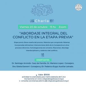 Charla sobre abordaje integral del conflicto en la etapa previaEl viernes 20 de octubre a las 15 hs en modalidad virtual los/as Drs. Santiago Arrondo, Mariano López, Estela Eseverri y Federico Eugui dialogarán con los/as interesados/as al respecto de esta temática. LEER MÁS |