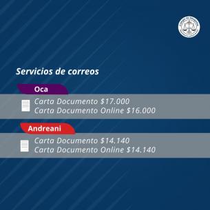 Valores vigentes para el envío de Carta DocumentoMatriculadas y matriculados tienen a disposición en Mesa de Entradas del Colegio de Abogados Departamental, los servicios de correo OCA o Andreani, de acuerdo a su preferencia. LEER MÁS |