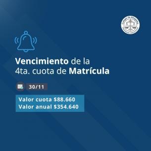 Vencimiento de la 4º Cuota de Matrícula 2025Recordamos que el 30 de noviembre vence el plazo para el pago de la 4º cuota de la matrícula 2025, cuyo importe equivale al 100% de 2 jus arancelarios, es decir, $88.660,00. Los abogados y abogadas con hasta tres años de antigüedad desde su matriculación (año calendario) abonarán el 50%, por lo que el valor correspondiente es de $44.330,00. LEER MÁS |
