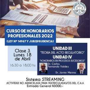 Continúa el Curso de Honorarios ProfesionalesLos días lunes 18 y 25/04, de 16.30 a 18hs, se dictarán las últimas dos clases del curso que cuenta un destacado equipo docente integrado por el Dr. Carlos Fernando Valdez, la Dra. Sandra Gianatti, el Dr. Jeremías del Río y el Dr. Javier Menna. Esta capacitación es no arancelada para matriculadas y matriculados. LEER MÁS |
