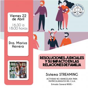 Charla: “Resoluciones judiciales y su impacto en las relaciones de familia”La Dra. Marisa Herrera disertará sobre esta temática el 22 de abril de 16:30 a 18 hs, vía sistema Streaming. Podés inscribirte, completando el formulario online, haciendo click aquí. LEER MÁS |