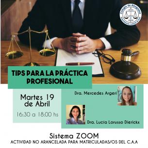 Charla- Taller: “Tips para la práctica profesional”La Dra. Mercedes Argeri y la Dra. Lucía Lorusso Dierickx brindarán esta capacitación no arancelada para matriculadas y matriculados del C.A.A, vía sistema Zoom, el martes 19 de abril de 16:30 a 18hs. Podés inscribirte online, haciendo click aquí. LEER MÁS |