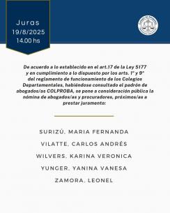 Acto de Jura de nuevas matriculadas y matriculadosEl próximo martes 19 de agosto se realizará un nuevo acto de jura de matriculados/as en la sede de nuestro Colegio de Abogados Departamental. Desde las 14 hs las autoridades acompañarán a la nómina de profesionales que se pone a consideración pública. LEER MÁS |