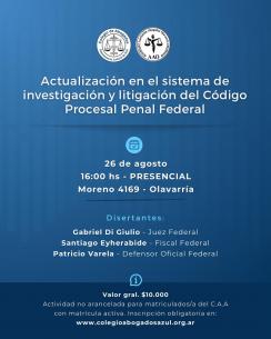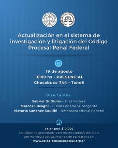 Se realizará un curso de actualización sobre el Código Procesal Penal Federal en TandilSe realizará de forma presencial en la Subsede del Colegio (Chacabuco 744, Tandil) el próximo 19 de agosto. LEER MÁS |