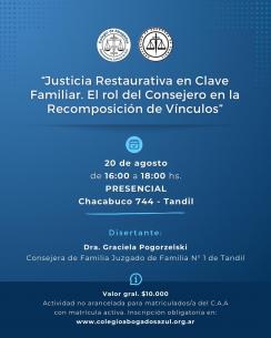 Nuevo curso sobre justicia restaurativa en clave familiar en TandilSe realizará el próximo 20 de agosto a partir de las 16 horas en la Subsede del Colegio, ubicada en Chacabuco 744. Estará a cargo de la Dra. Graciela Pogorzelski, Consejers de Familia del Juzgado de Familia Nro 1 de Tandil. LEER MÁS |