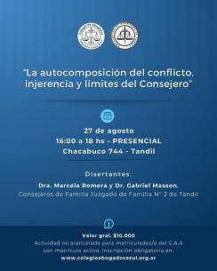 Nueva actividad sobre la autocomposición del conflicto, injerencia y límites del ConsejeroSe realizará de forma presencial en Chacabuco 744, Tandil, el próximo 27 de agosto a las 16 hs. LEER MÁS |