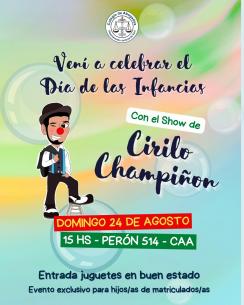 Cirilo Champiñón se presentará en el Colegio para celebrar el Día de las InfanciasEl próximo domingo 24 de agosto a partir de las 15 hs los esperamos en la sede del Colegio para celebrar juntos/as. El show es exclusivo para hijos/as de matriculados/as y la entrada al espectáculo será un juguete en buen estado. LEER MÁS |