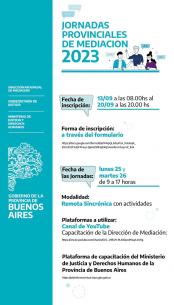 Inscripción abierta a las Jornadas Provinciales de MediaciónLa Dirección Provincial de Mediación de la Subsecretaría de Justicia dependiente del Ministerio de Justicia y Derechos Humanos de la Provincia de Buenos Aires informó que ya se encuentra habilitada la inscripción para participar en las Jornadas de Mediación a realizarse entre el lunes 25 y el martes 26 de septiembre. LEER MÁS |