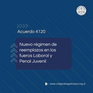 Nuevo régimen de reemplazos en los fueros Laboral y Penal JuvenilA través del Acuerdo Nº 4120 la Suprema Corte de Justicia dispuso actualizar la normativa en materia de reemplazos en los Tribunales de Trabajo y Juzgados de Responsabilidad Penal Juvenil. LEER MÁS |