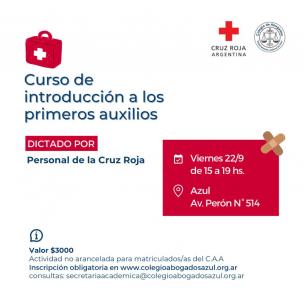 Curso de introducción a RCP y primeros auxilios en AzulEl Colegio de Abogados Departamental en colaboración con Cruz Roja Argentina, ha organizado un Curso de RCP e introducción a los Primeros Auxilios que se dictará el el 22 de septiembre a las 15 hs en la Sede del Colegio, ubicada en Av. Perón 514. LEER MÁS |