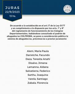 Acto de Jura de nuevas matriculadas y matriculadosEl viernes 22 de septiembre a las 13 hs, con modalidad presencial en la sede de Azul (Av. Perón 514) y transmisión vía YouTube; las autoridades del Colegio de Abogados Departamental tomarán juramento a las abogadas y abogados cuya nómina ponemos en consideración pública. LEER MÁS |