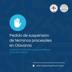 Pedido de suspensión de términos procesales en OlavarríaAnte el estado de emergencia declarado en la ciudad de Olavarría se solicitó a la SCBA la suspensión de términos procesales en la ámbito de dicha ciudad dado que resulta imposible ofrecer las prestaciones básicas ante la interrupción energética ocasionada por el temporal. LEER MÁS |