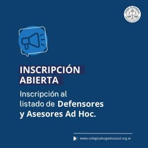 Inscripción abierta al listado de Defensores y Asesores Ad HocPara realizar la inscripción la/el matriculada/o deberá reunir los requisitos necesarios y ponerse en contacto por correo electrónico con el Colegio de Abogados Departamental al correo secretaria@colegioabogadosazul.org.ar LEER MÁS |